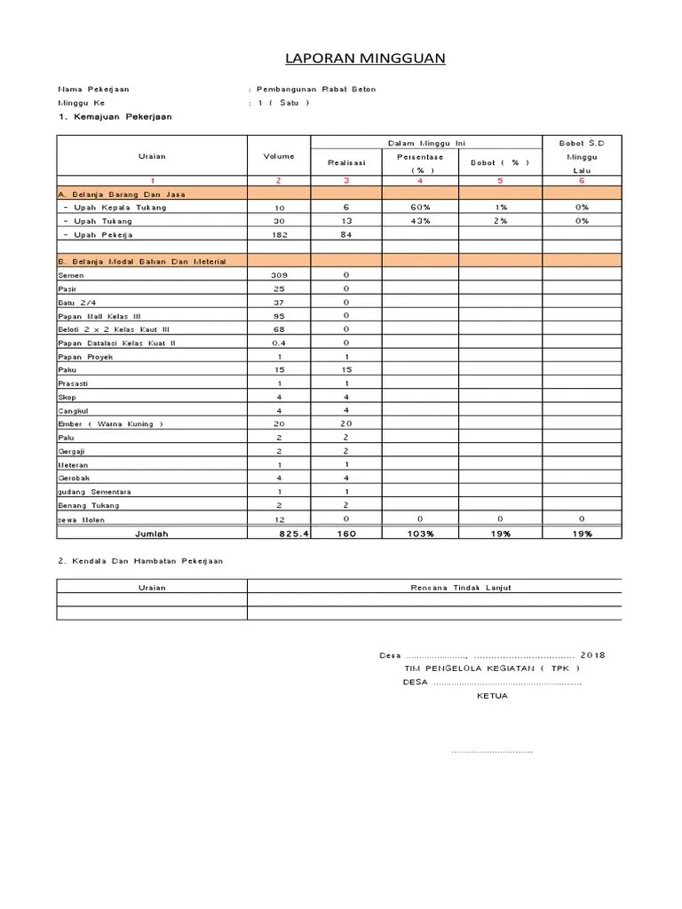 Laporan realisasi fisik dan keuangan. Laporan hasil penyelesaian fisik dan laporan penggunaan dana sebagaimana terlampir. 44, target fisik dan keuangan 100 %. S/d akhir minggu viii 10 november 2017 s/d 11 november 2017. Pembangunan jamban sd inpres 11 kayumaboko. Laporan mingguan berupa tabel perhitungan pencapaian kemajuan fisik pekerjaan. Progres fisik (%)=(a)/(b) x 100%. 5, (untuk dak non fisik, laporan mohon disesuaikan dengan format pada lampiran pmk 48/pmk.07/2019). 3, untuk dak non fisik, laporan mohon disesuaikan dengan format pada . Selesai 100% sesuai dengan spesifikasi yang ditentukan. Laporan akhir dak tahun 2019 rsjd surakarta. Atau 89,19% dan realisasi fisik sebesar 100%. 1 penyusunan laporan keuangan dan spip.